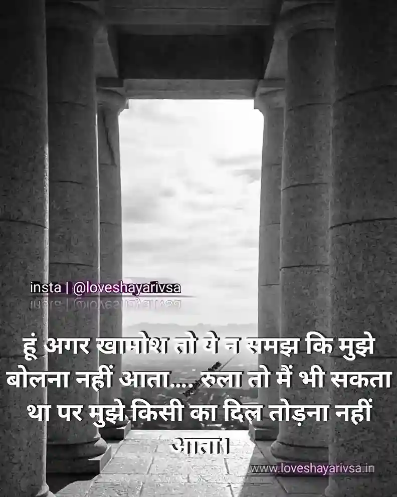 इस संग्रह में हर तरह की सैड शायरी हिंदी और अंग्रेजी (Sad Shayari in Hindi & English) भाषाओं में उपलब्ध है। अपनी हृदय की स्थिति के अनुसार शायरी चुनकर आप अपने प्रेमी और दोस्तों को भेज सकते हैं। Whatsapp Facebook or Instagram पर साझा करने के लिए सैड स्टेटस (Sad Status Image) चित्र के साथ भी यहाँ उपलब्ध हैं।