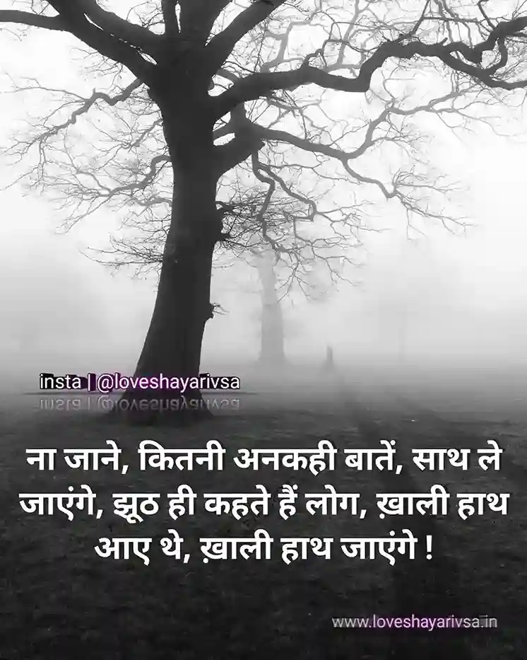 इस संग्रह में हर तरह की सैड शायरी हिंदी और अंग्रेजी (Sad Shayari in Hindi & English) भाषाओं में उपलब्ध है। अपनी हृदय की स्थिति के अनुसार शायरी चुनकर आप अपने प्रेमी और दोस्तों को भेज सकते हैं। Whatsapp Facebook or Instagram पर साझा करने के लिए सैड स्टेटस (Sad Status Image) चित्र के साथ भी यहाँ उपलब्ध हैं।