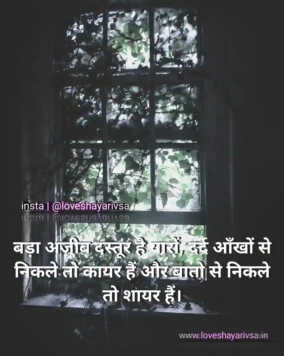 इस संग्रह में हर तरह की सैड शायरी हिंदी और अंग्रेजी (Sad Shayari in Hindi & English) भाषाओं में उपलब्ध है। अपनी हृदय की स्थिति के अनुसार शायरी चुनकर आप अपने प्रेमी और दोस्तों को भेज सकते हैं। Whatsapp Facebook or Instagram पर साझा करने के लिए सैड स्टेटस (Sad Status Image) चित्र के साथ भी यहाँ उपलब्ध हैं।